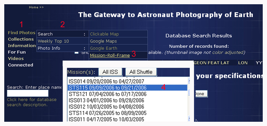En allant sur le site The Gateway to Astronaut Photography of Earth pour chercher vous-même des images de la Mission STS 115 vous devez procéder comme indiqué sur la démonstration suivante, 1 Find Photos, 2 Search, 3 Mission-Roll-Frame et enfin 4 STS 115, puis sans oublier de cocher en bas de cette page la ligne : OUT PAGING Page the output. If this is not checked, then the output is all shown on the same page et ensuite Run query :