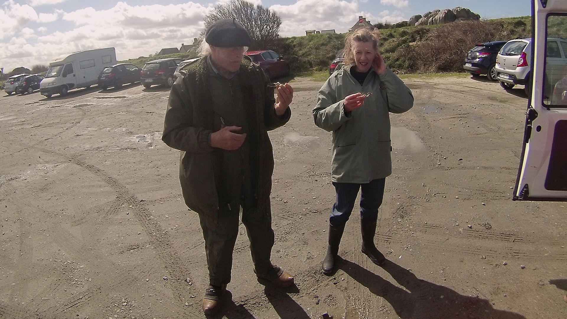 Maenzao et Joëlle, en plein goûter d'algues. Remarquez les sabots de Maenzao. Fabiqués par le dernier sabotier du Finistère. Si vous voulez acheter de beaux sabots, Maenzao vous dira où les trouver.